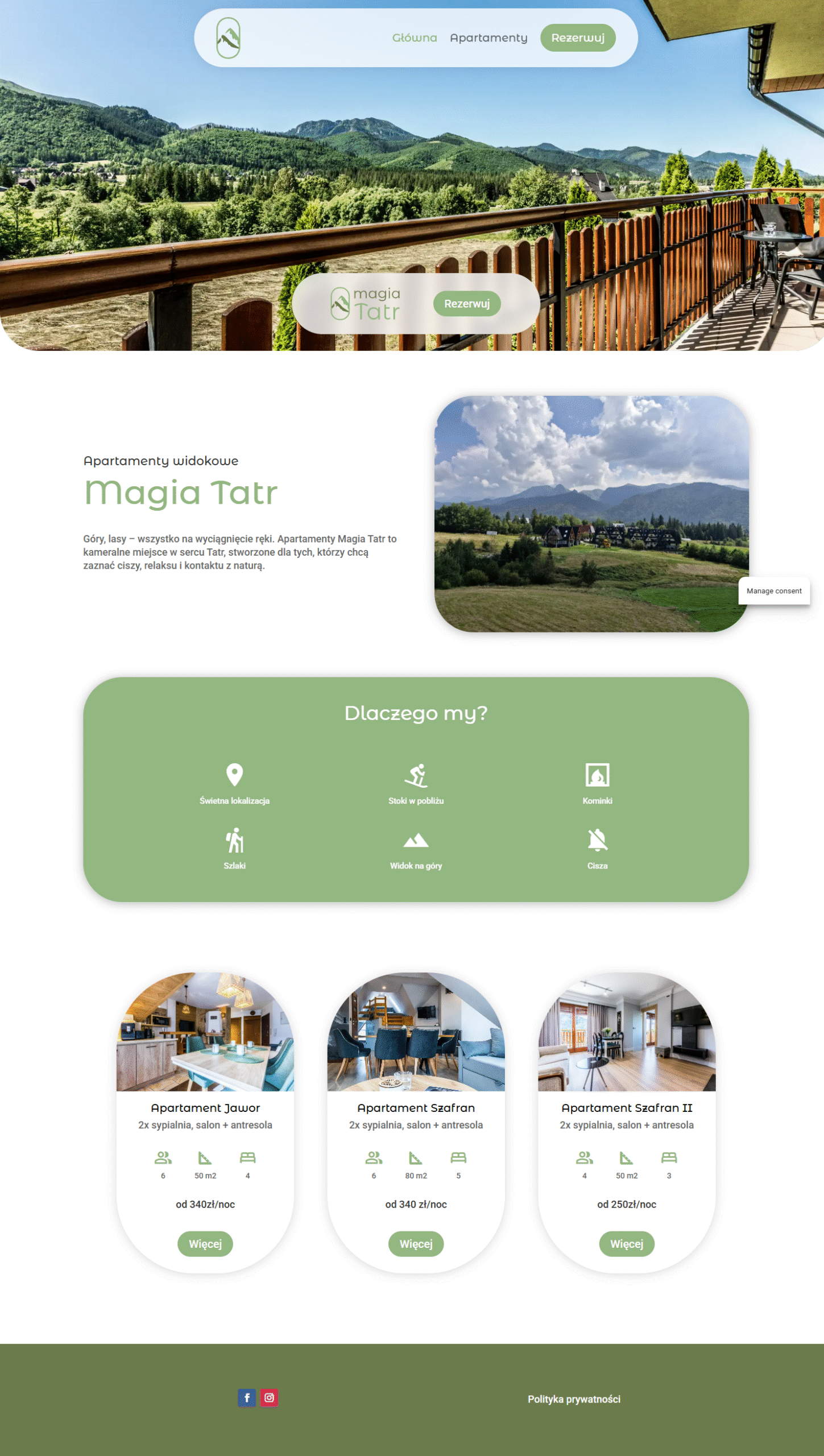 Nowoczesna strona internetowa stworzona dla apartamentu widokowego. Celem projektu było zaprezentowanie miejsca na wypoczynek, które zapewnia spokój i prywatność, jednocześnie będąc blisko centrum miasta i kluczowych atrakcji turystycznych Zakopanego.